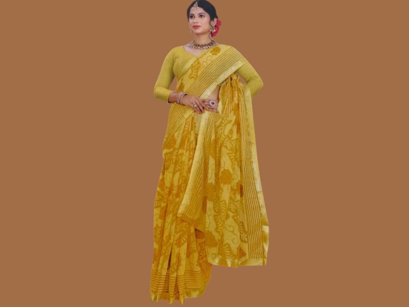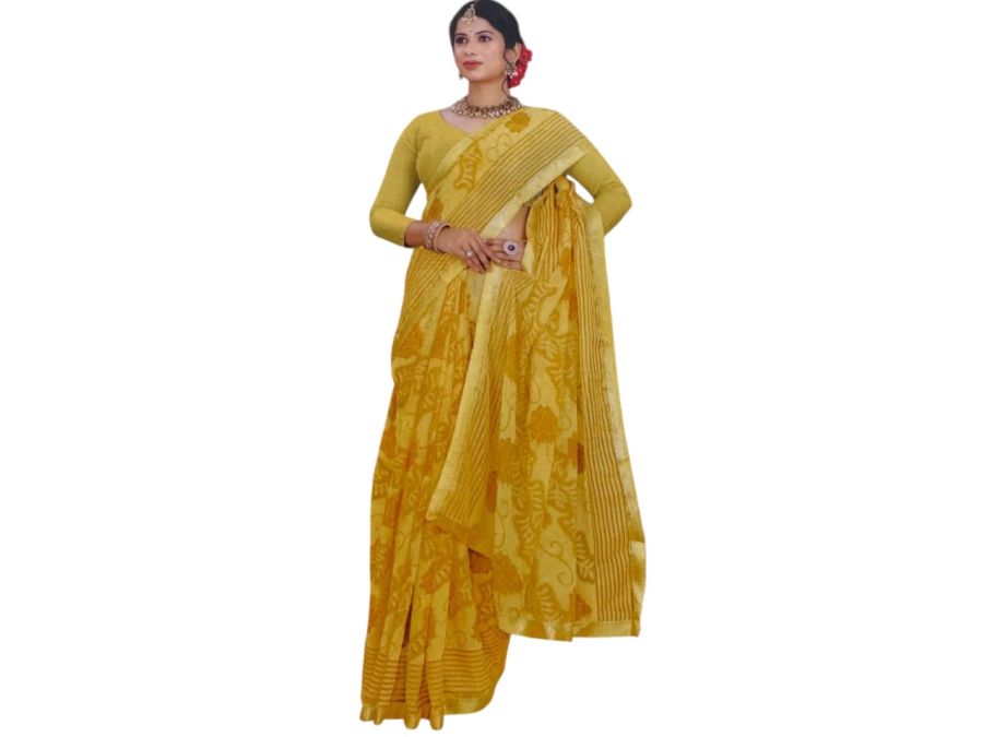 Stylish mustard yellow printed saree featuring elegant floral patterns and a graceful border. Lightweight and comfortable, perfect for daily wear and festive occasions.