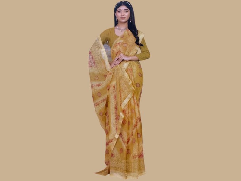 Beautiful mustard yellow saree with traditional prints and elegant border. Lightweight and comfortable, perfect for daily and festive wear.