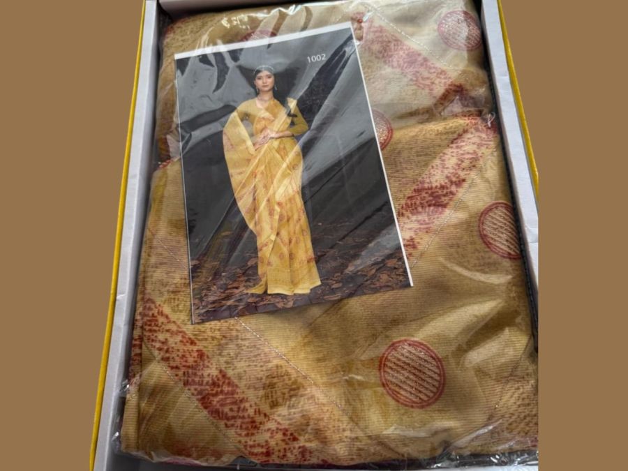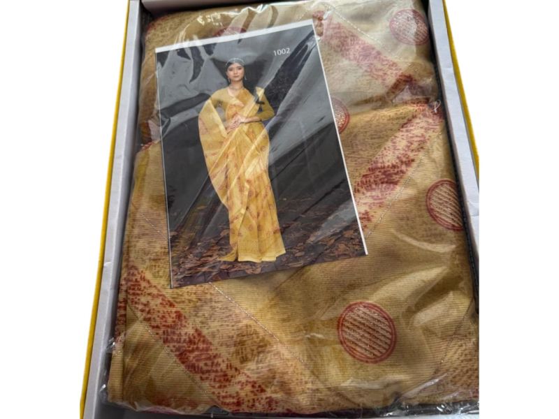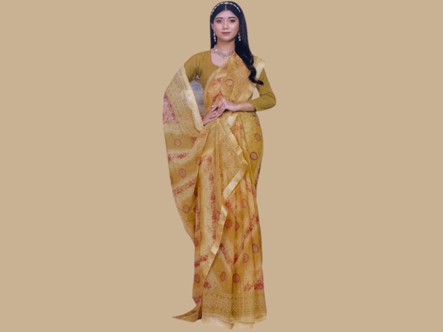 खूबसूरत मस्टर्ड येलो साड़ी जिसमें ट्रेडिशनल प्रिंट और एलिगेंट बॉर्डर है। हल्की और आरामदायक, रोज़ाना और त्योहारों के लिए परफेक्ट।