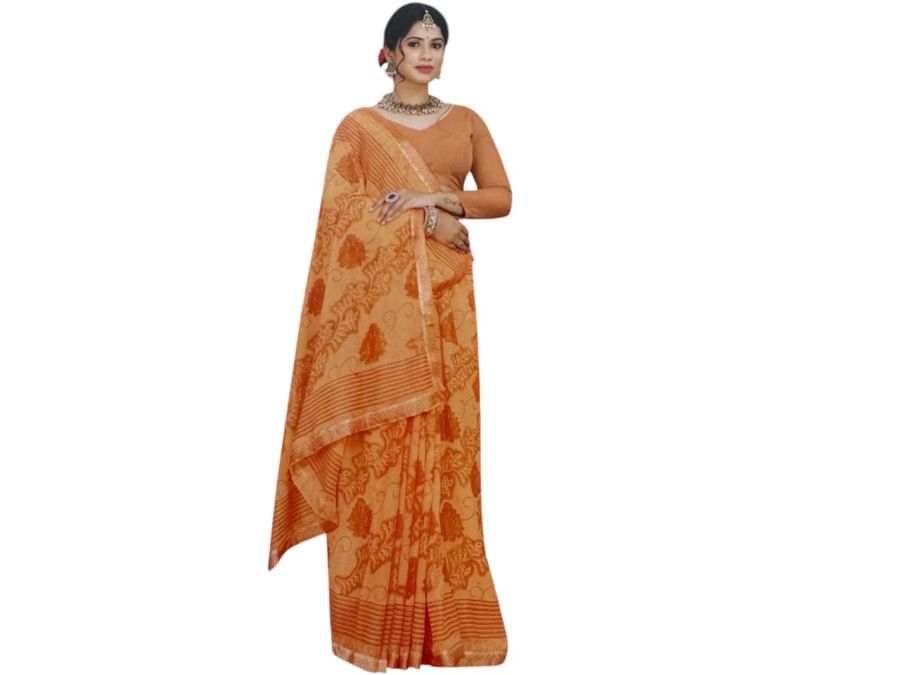 Stylish peach-orange saree with traditional prints and elegant border. Lightweight and comfortable, perfect for daily wear and festive occasions.