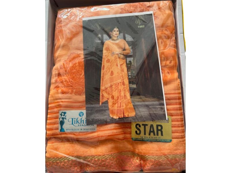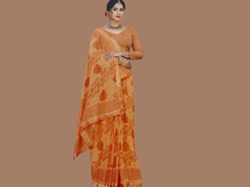 स्टाइलिश पीच-ऑरेंज साड़ी जिसमें ट्रेडिशनल प्रिंट और एलिगेंट बॉर्डर है। हल्की और आरामदायक, रोज़ाना और त्योहारों के लिए परफेक्ट।