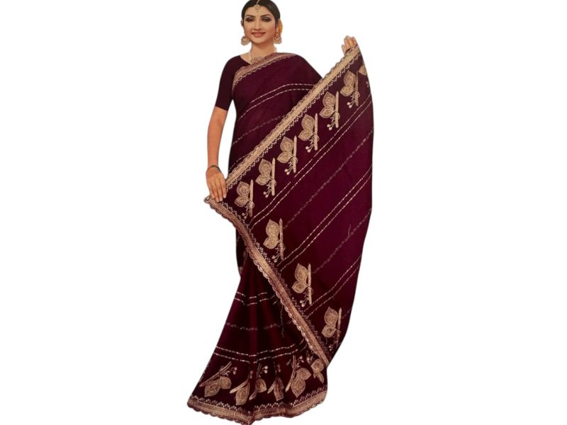 Is khubsurat wine-coloured saree mein heavy embroidery aur stone work ka perfect blend hai. Iska scalloped border aur designer butterfly/leaf motif ise wedding, festivals aur parties ke liye ek ideal choice banata hai. Iske saath matching unstitched blouse piece bhi shamil hai.
