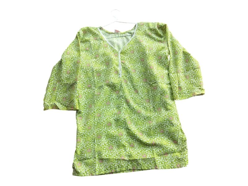 यह ग्रीन प्रिंटेड वुमेन टॉप हाई-क्वालिटी कॉटन फैब्रिक से बना है, जो गर्मियों में पहनने के लिए बेहद आरामदायक है। इसमें आकर्षक ऑल-ओवर प्रिंट डिज़ाइन और V-नेक स्टाइल दिया गया है, जो इसे कैजुअल और डेली वियर के लिए परफेक्ट बनाता है।