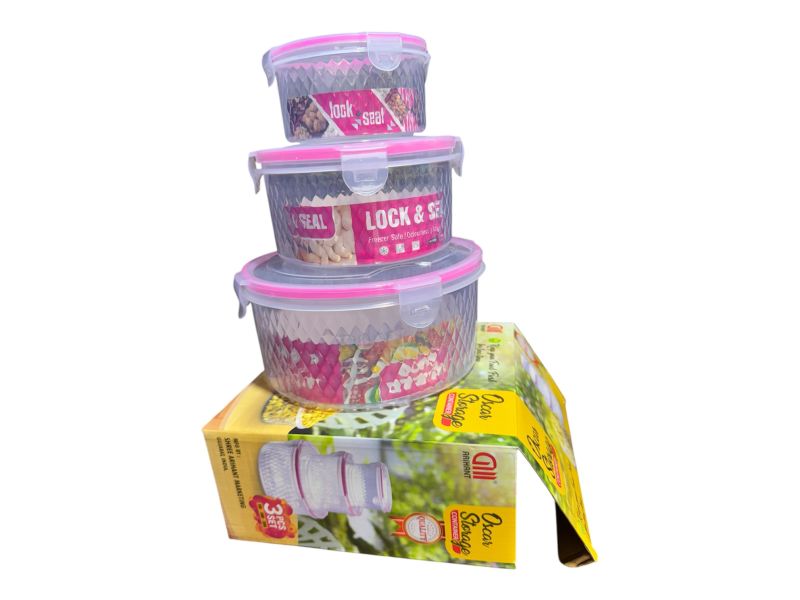 3 पीस लॉक & सील एयरटाइट फूड स्टोरेज कंटेनर सेट। फ्रीजर सेफ, लीक-प्रूफ और ओडरलेस डिजाइन के साथ किचन में अनाज, स्नैक्स और बचा हुआ खाना स्टोर करने के लिए परफेक्ट।