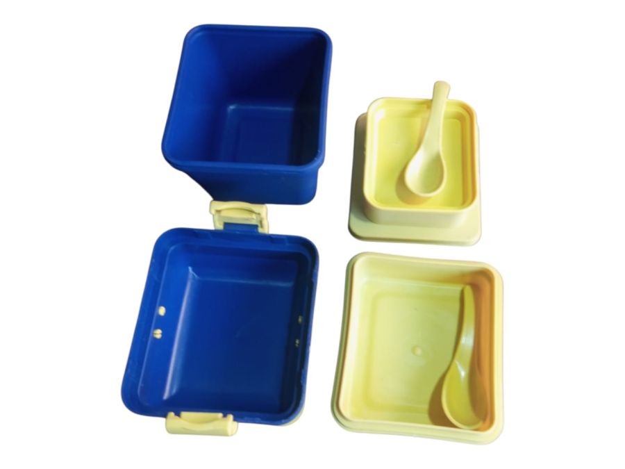 स्पून के साथ कॉम्पैक्ट प्लास्टिक लंच बॉक्स। बच्चों और ऑफिस के लिए परफेक्ट टिफिन।