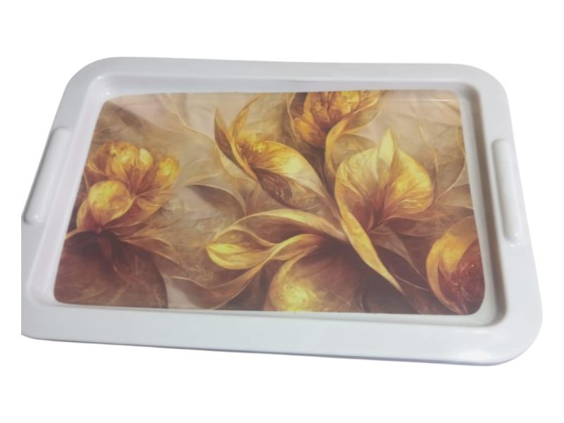 डिज़ाइनर प्रिंटेड प्लास्टिक सर्विंग ट्रे – चाय, नाश्ता और स्नैक्स सर्व करने के लिए मजबूत और स्टाइलिश ट्रे।