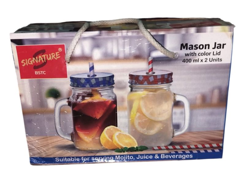 Signature Mason Jar 400ml Set of 2 with Color Lid & Straw | Glass Handle Mug for Juice, Mojito & Cold Drinks
