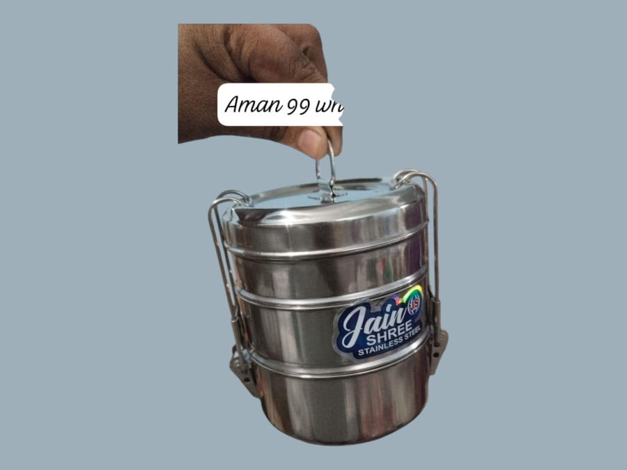 Durable stainless steel 3 layer tiffin box with strong locking clips and handle. Ideal for office, school and travel use.