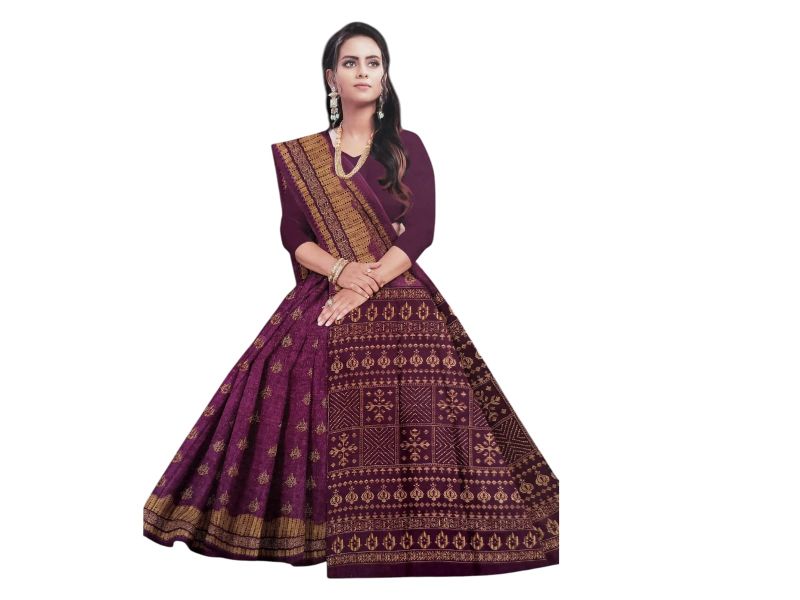 स्टाइलिश मारून और गोल्ड प्रिंटेड साड़ी, जो शादी, पार्टी और फेस्टिवल के लिए परफेक्ट है।