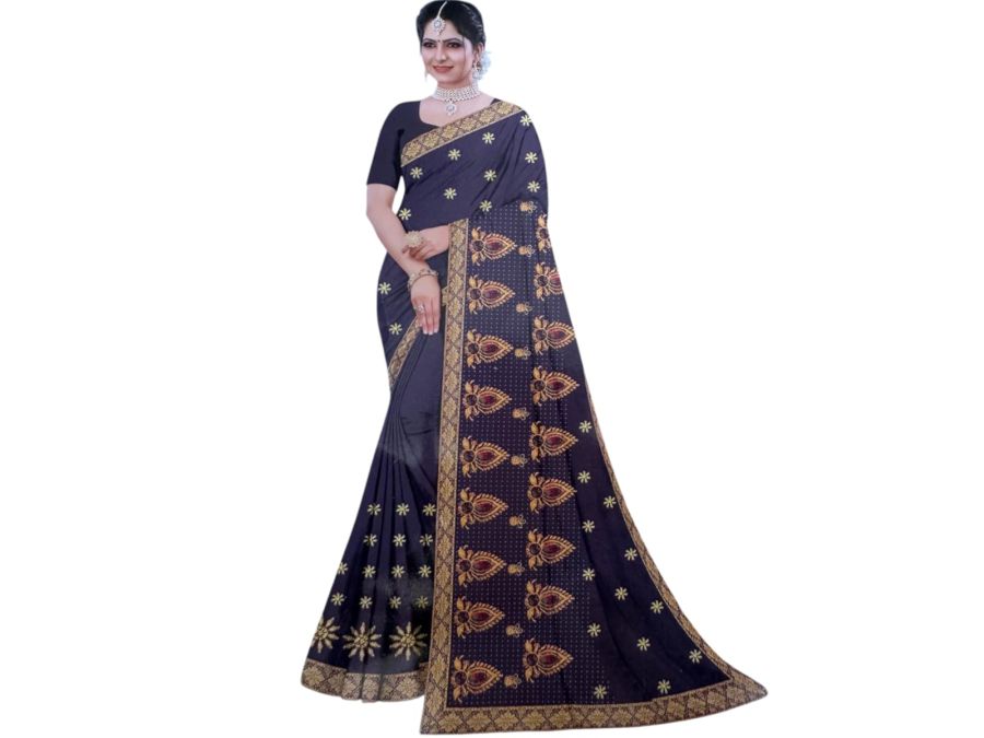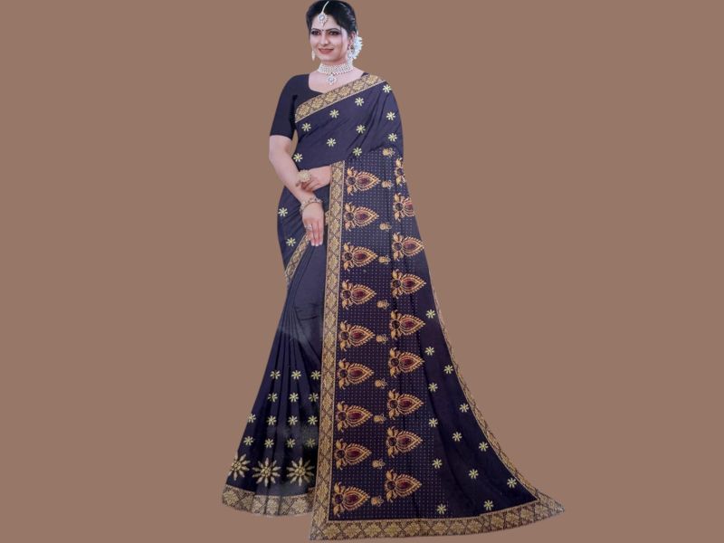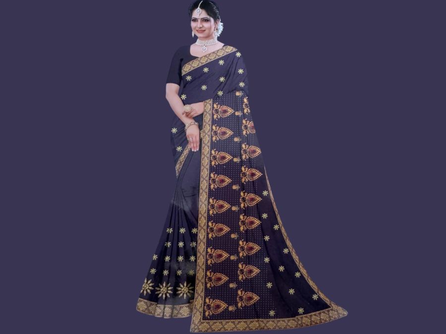 डार्क नेवी ब्लू साड़ी गोल्डन मोटिफ और जरी बॉर्डर के साथ – शादी और पार्टी वियर के लिए परफेक्ट।