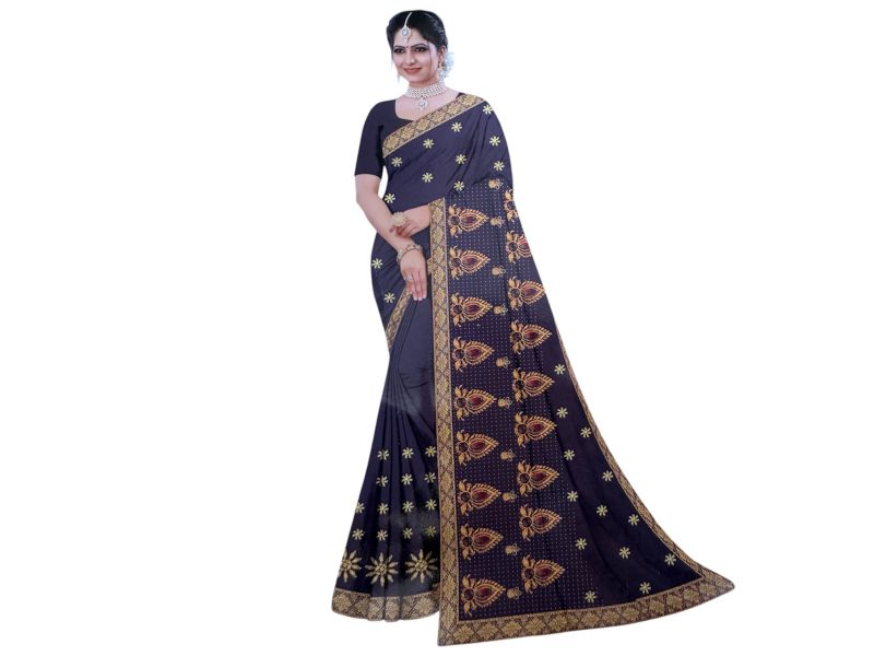 महिलाओं के लिए खूबसूरत एम्ब्रॉयडरी साड़ी, गोल्डन बॉर्डर के साथ, शादी-पार्टी और फेस्टिव वियर के लिए परफेक्ट।