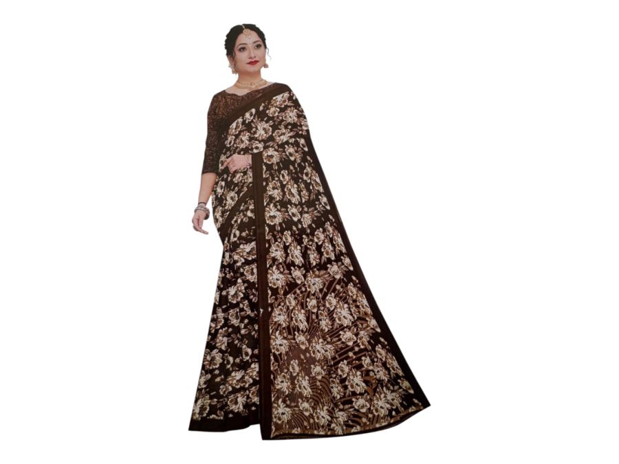 एलिगेंट डार्क ब्राउन फ्लोरल साड़ी – पार्टी, शादी और फेस्टिव वियर के लिए परफेक्ट।