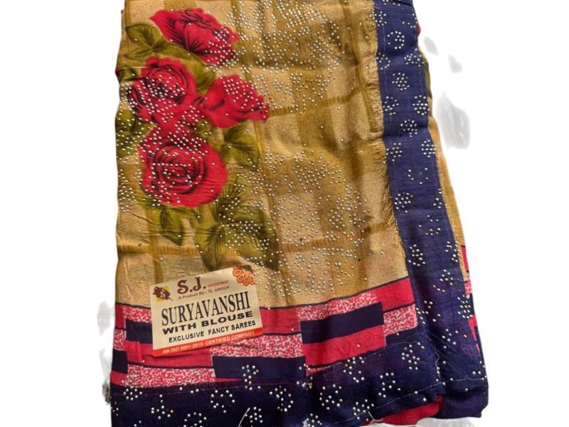 Women’s Golden Floral Printed Saree with Stone Work & Blouse Piece – Designer Party & Wedding Wear Saree