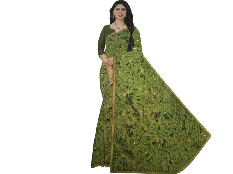 स्टाइलिश ग्रीन प्रिंटेड साड़ी – एलीगेंट और क्लासी लुक के लिए परफेक्ट।