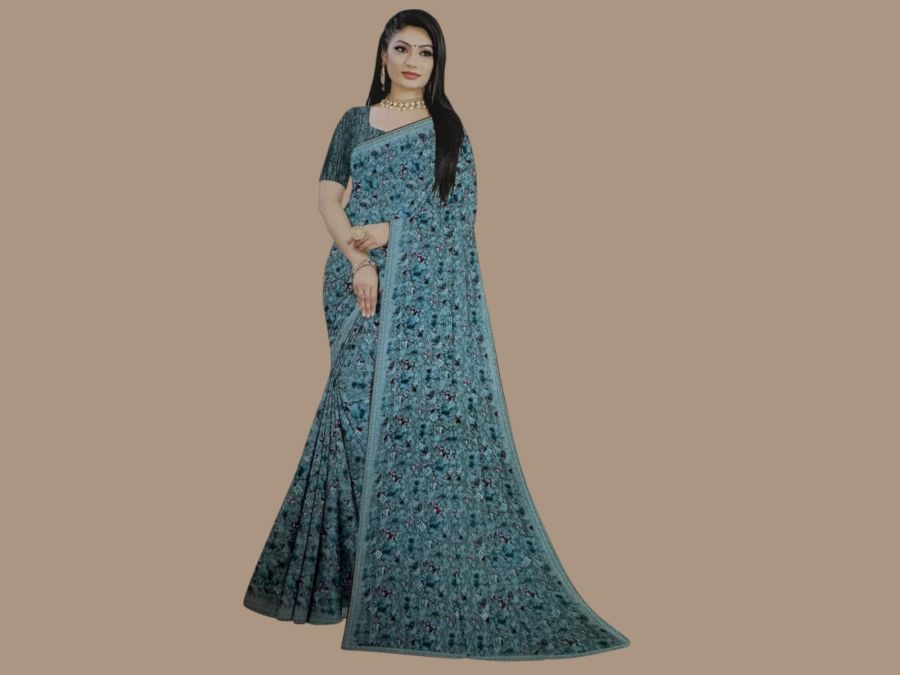 एलिगेंट फ्लोरल प्रिंट साड़ी – स्टाइलिश लुक के लिए परफेक्ट चॉइस।