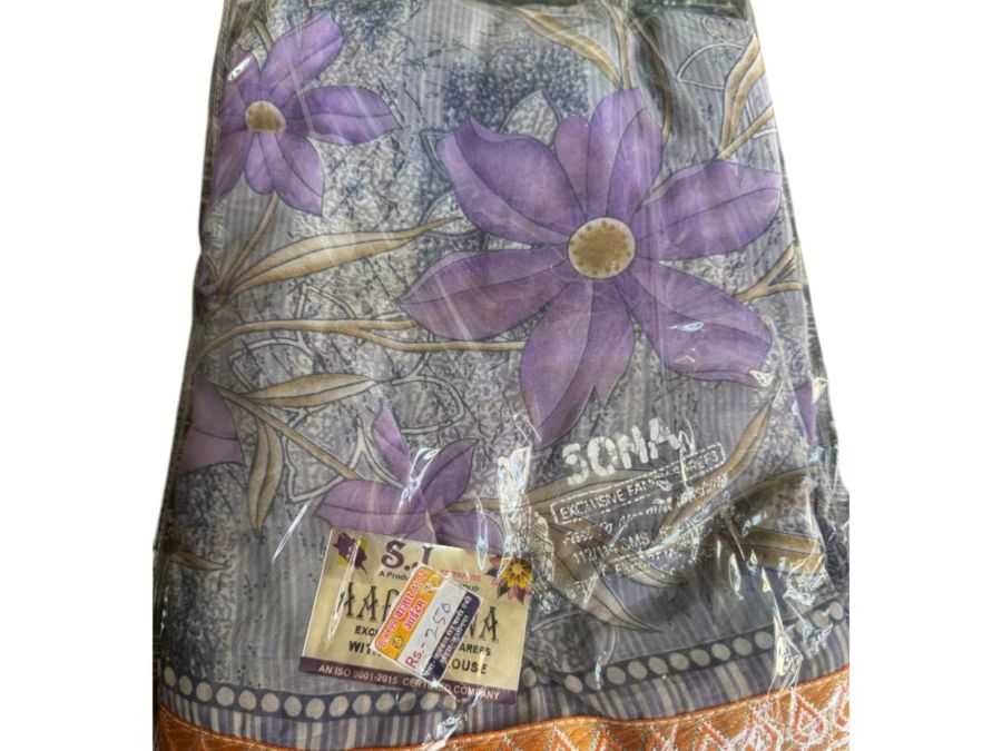 ग्रे बेस पर पर्पल फ्लोरल डिजाइन – सिंपल, क्लासी और एलिगेंट लुक वाली साड़ी।