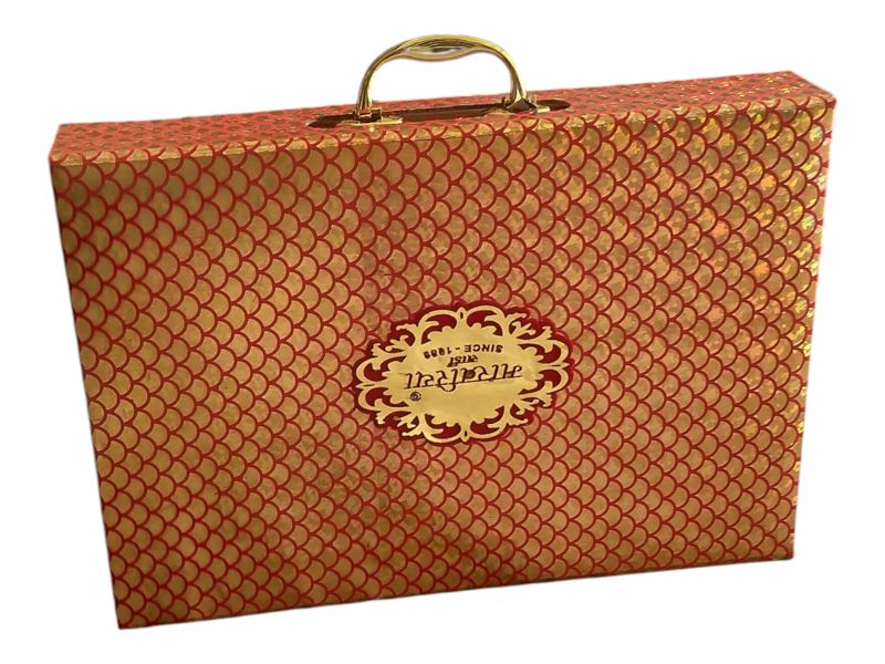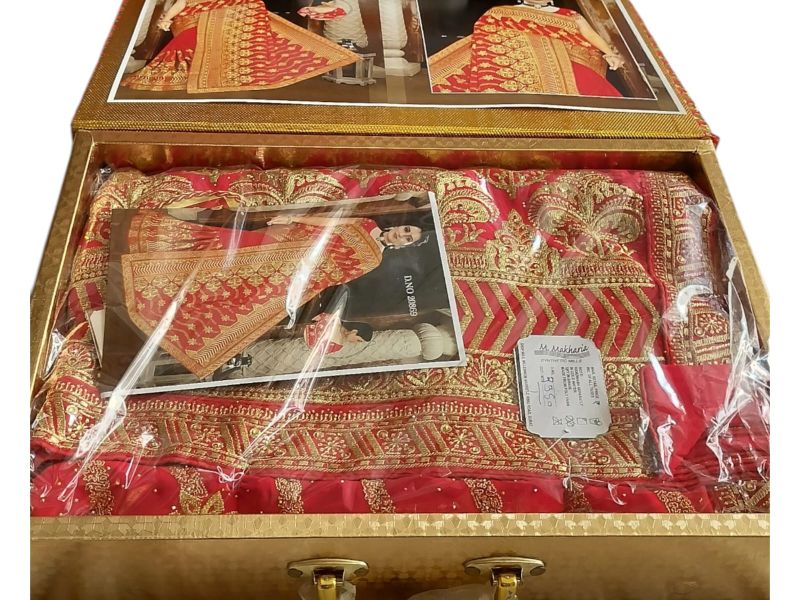 हेवी ब्राइडल रेड साड़ी गोल्डन जरी वर्क के साथ – रॉयल वेडिंग लुक और प्रीमियम बॉक्स पैकिंग।