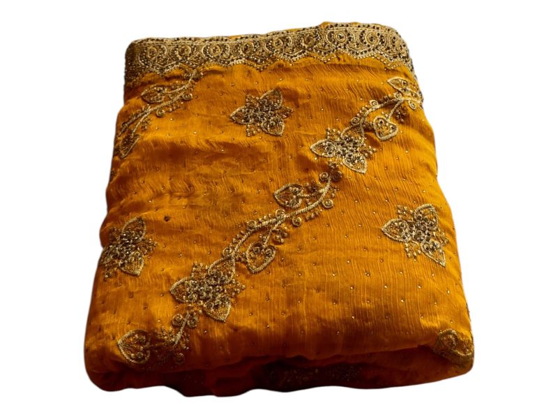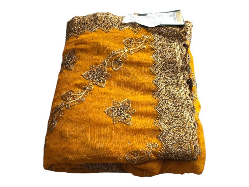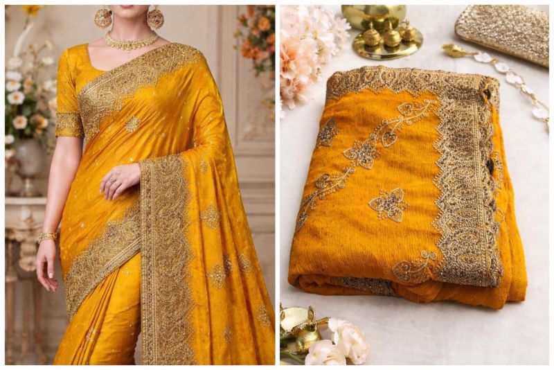 मस्टर्ड येलो साड़ी शानदार गोल्डन एम्ब्रॉयडरी के साथ – शादी और फेस्टिव के लिए परफेक्ट।