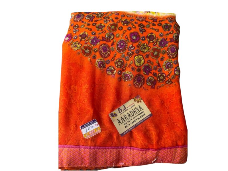 ब्राइट ऑरेंज फ्लोरल साड़ी – फेस्टिव और पार्टी के लिए परफेक्ट चॉइस।