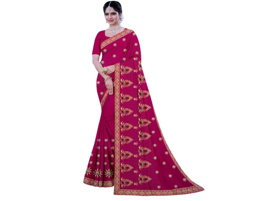 रानी पिंक साड़ी शानदार गोल्डन पेसली डिजाइन और जरी बॉर्डर के साथ – शादी और पार्टी के लिए बेस्ट चॉइस।