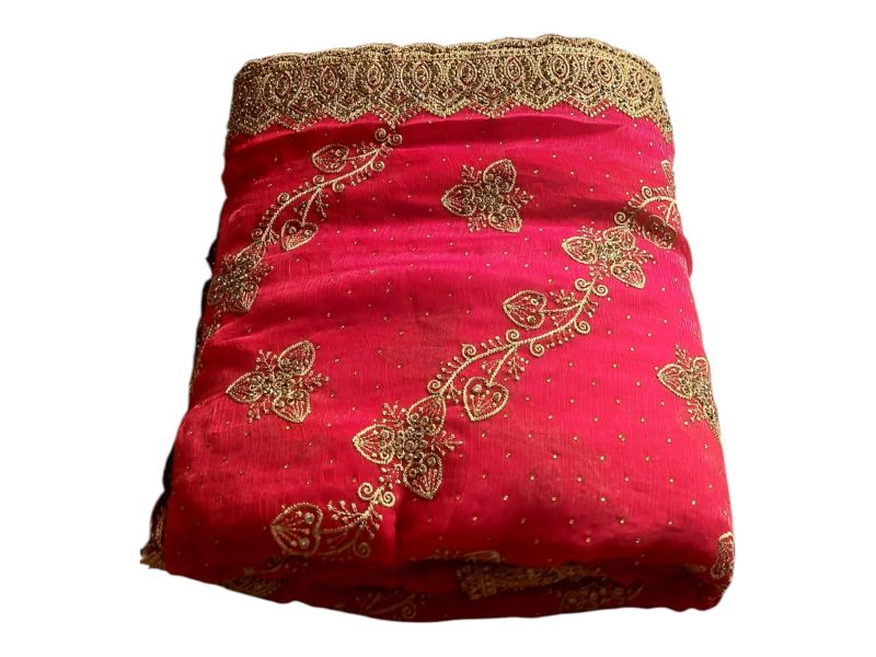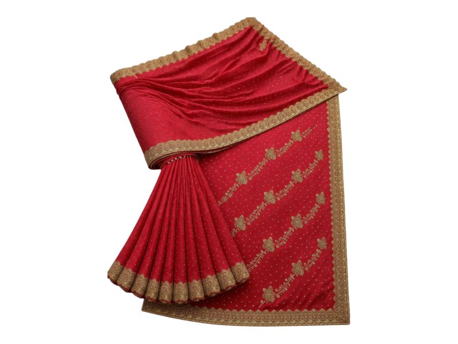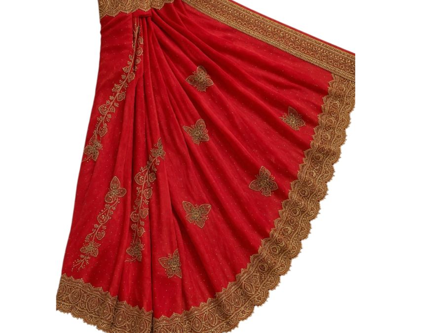 रिच रेड साड़ी शानदार गोल्डन एम्ब्रॉयडरी के साथ – शादी और पार्टी के लिए परफेक्ट।