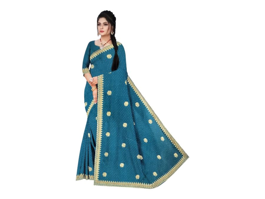 Women’s Teal Blue Designer Saree with Golden Butti & Lace Border – Party Wear & Festive Saree with Blouse Piece
